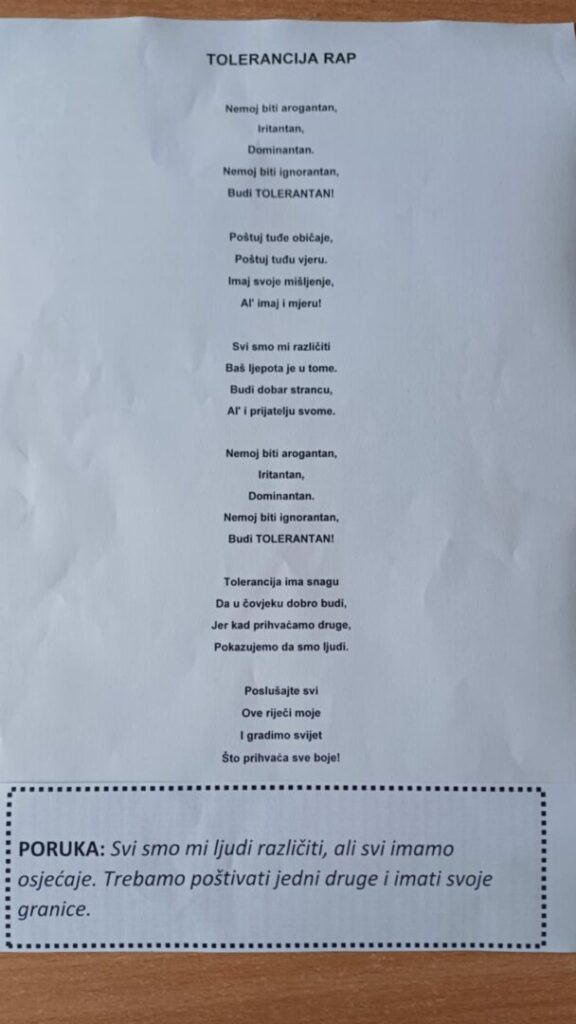 Međunarodni dan tolerancije obilježen je 16. studenoga. Taj dan podsjeća nas kako trebamo poštivati i uvažavati drugačije od nas. U našoj je školi obilježen sudjelovanjem učenika u natječaju „Oboji svijet“ Foruma za slobodu odgoja. U natječaju su sudjelovali sljedeći učenici: Nives Murar, Lena Šulc, Mia Han, Lea Lukić, Nika Petrak, Petra Fahr, Magdalena Gašparović, Ela Nijemčević, Leda Pervan, Petra Kovačević, Ema Križić, Matija Bošnjak, Petar Šutalo, Lovro Lujić, Mia Miloš, Žana Hruška, Mia Miličević, Ivano Kniha, Petra Bacanović. U Zagreb smo mogli poslati samo tri rada te su poslani radovi Mije Han, Lede Pervan i Ele Nijemčević s porukama: