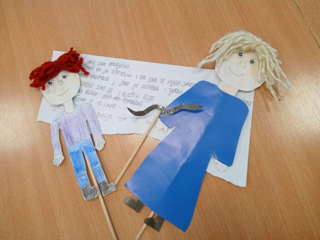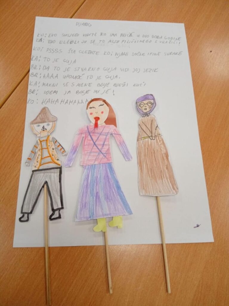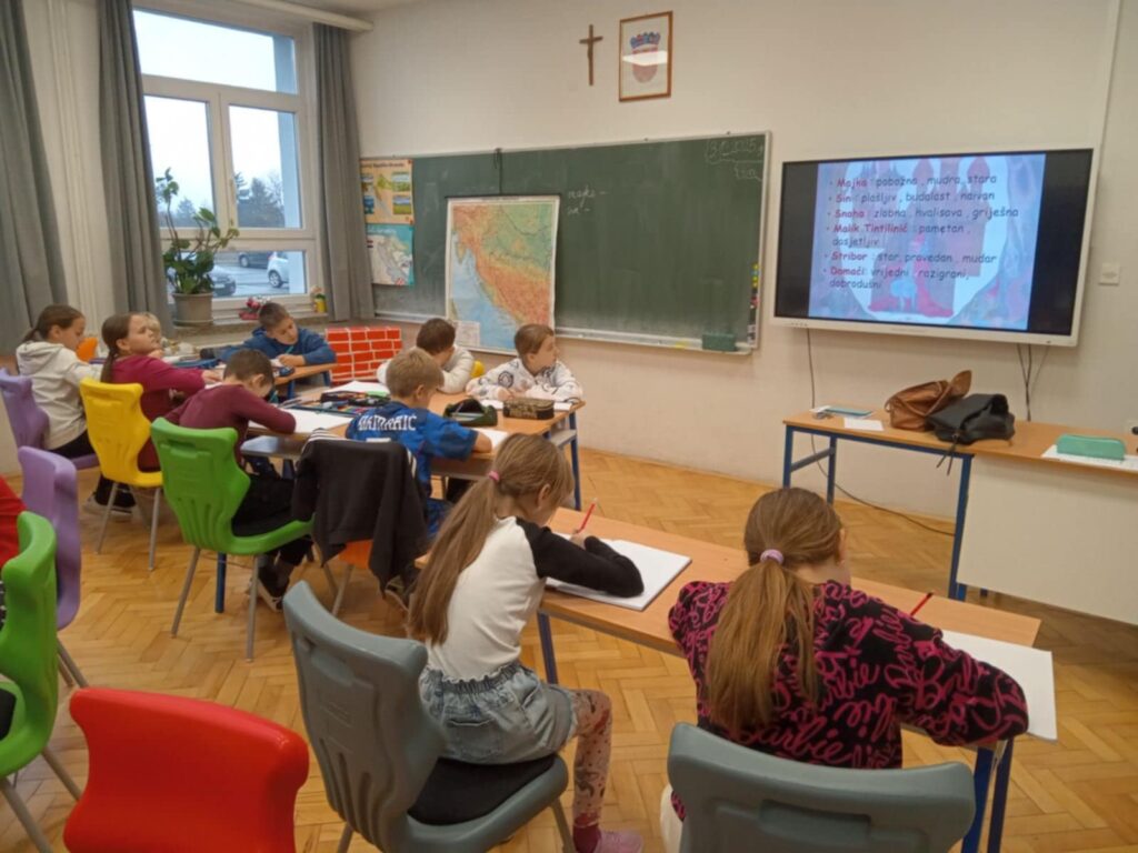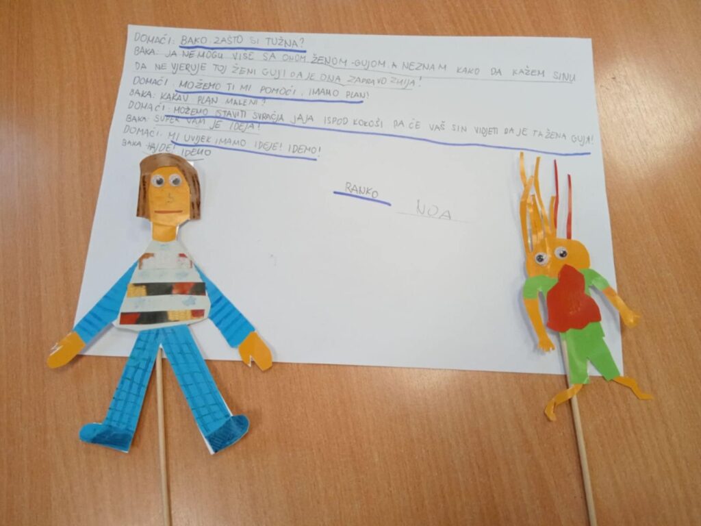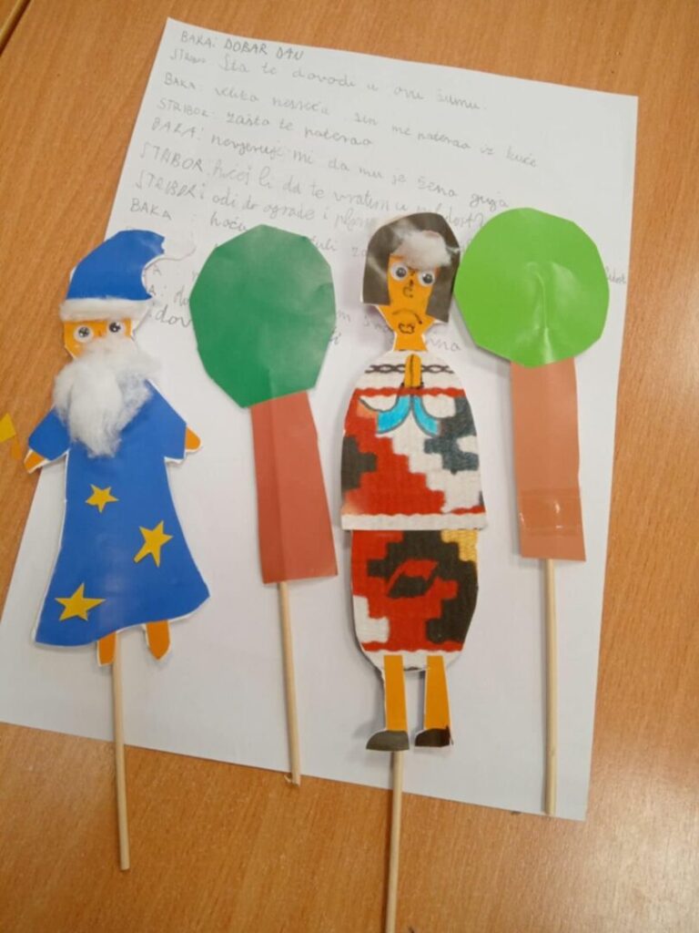 U srijedu 3. prosinca učenici 4.a obradili su lektiru “Šuma Striborova” u suradnji s knjižničarkom Melitom Horžicky-Radotić. Kroz nekoliko aktivnosti utvrdili su temu, osobine likova, spajali parove manje poznatih riječi i njihova značenja. Učenici su bili podijeljeni u pet skupina i svaka je skupina dobila zadatak uprizoriti jedan prizor iz bajke. Izradili su štapne lutke, napisali dijaloge i izveli ih na lutkarskoj pozornici. Pokazali su svoje znanje, maštu i kreativnost i dobro se zabavili.
