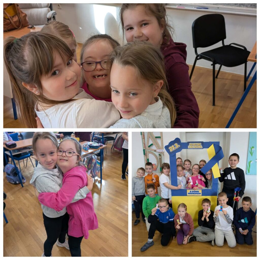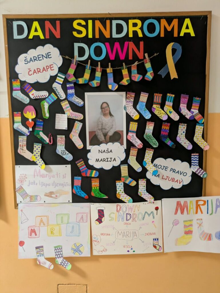 U proteklom tjednu naša škola obilježila je Svjetski dan osoba s Down sindromom, koji ove godine pada na subotu.  Sve aktivnosti bile su posvećene našoj učenici Mariji, a u obilježavanju su sudjelovali svi učenici škole zajedno sa svojim učiteljima i razrednicima. Učenici su s puno pažnje i ljubavi pisali poruke podrške Mariji te ih postavljali na plakat u školskom hodniku. Izrađivali su i edukativne materijale koji će joj pomoći u učenju, preuzete sa stranice Edukacijskog centra za Down sindrom iz Požege, kojemu zahvaljujemo na nesebičnom dijeljenju vrijednih sadržaja. Tijekom tjedna gledali su poučan video o Down sindromu, izrađivali plakate i ukrašavali svoje učionice porukama prihvaćanja i zajedništva. Posebno emotivan trenutak priredio je 1.a razred, koji pohađa naša Marija – na školskom igralištu pustili su plave i žute balone, ukrašene šarenim čarapicama koje su sami izradili, u čast svoje prijateljice. Marija je toga dana bila neizmjerno sretna, a njezin osmijeh bio je najljepša nagrada svima. Mariju Blašković vodili smo i u Glazbenu školu Požega, koja svake godine organizira koncert povodom Svjetskog dana osoba s Down sindromom. Što smo sve radili i kako nam je bilo, pogledajte u galeriji fotografija i kratkom videu na facebook stranici naše škole.